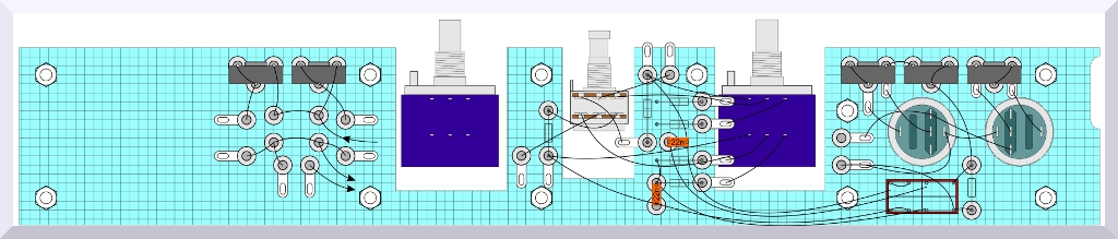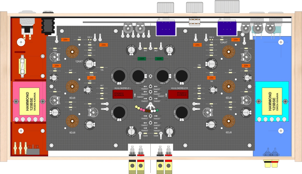 komponentit on sijoitettu vahvistimen etuosassa olevalle