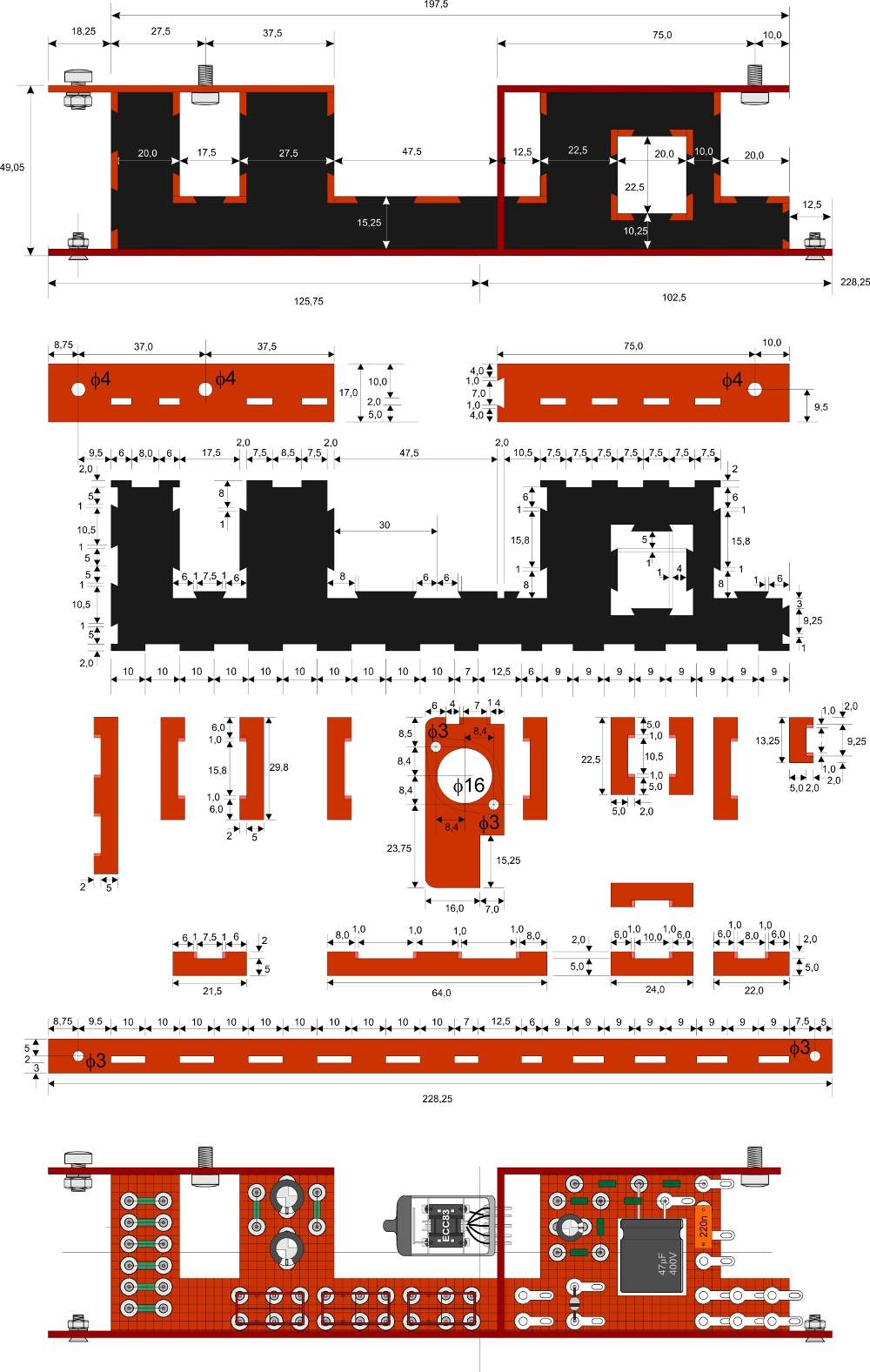 kytkimille ja säätimille. Alustan sivuille, eteen ja taakse liimataan 4 mm:n