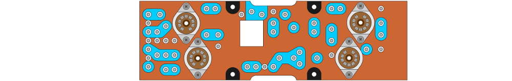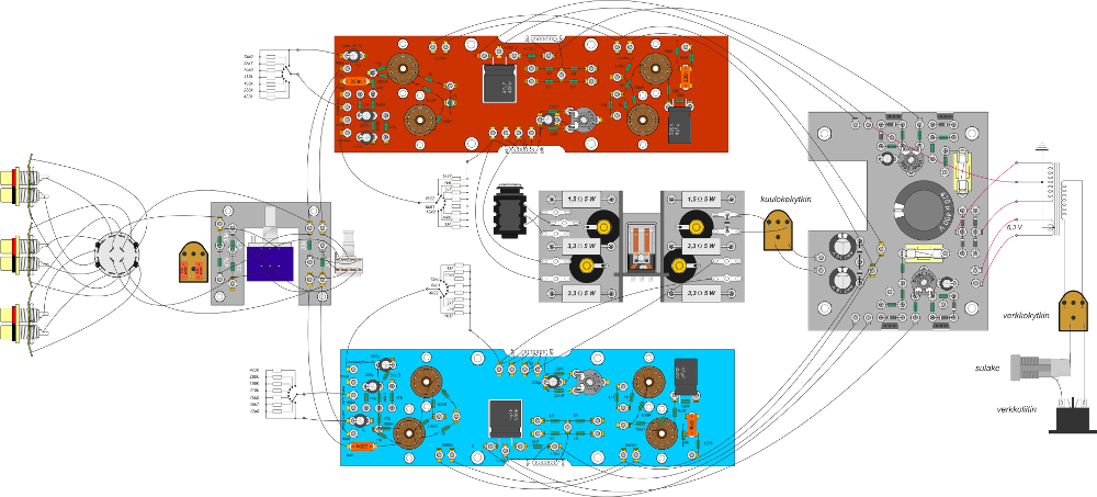 vahvistimen kytkentälevyt. Ylinnä on vasemman kanavan