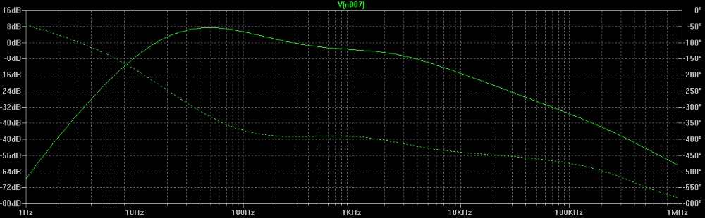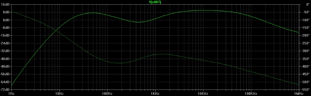 Vahvistimen taajuusvasteen simulaatiotulos sävynsäädöt keskiasennossa.