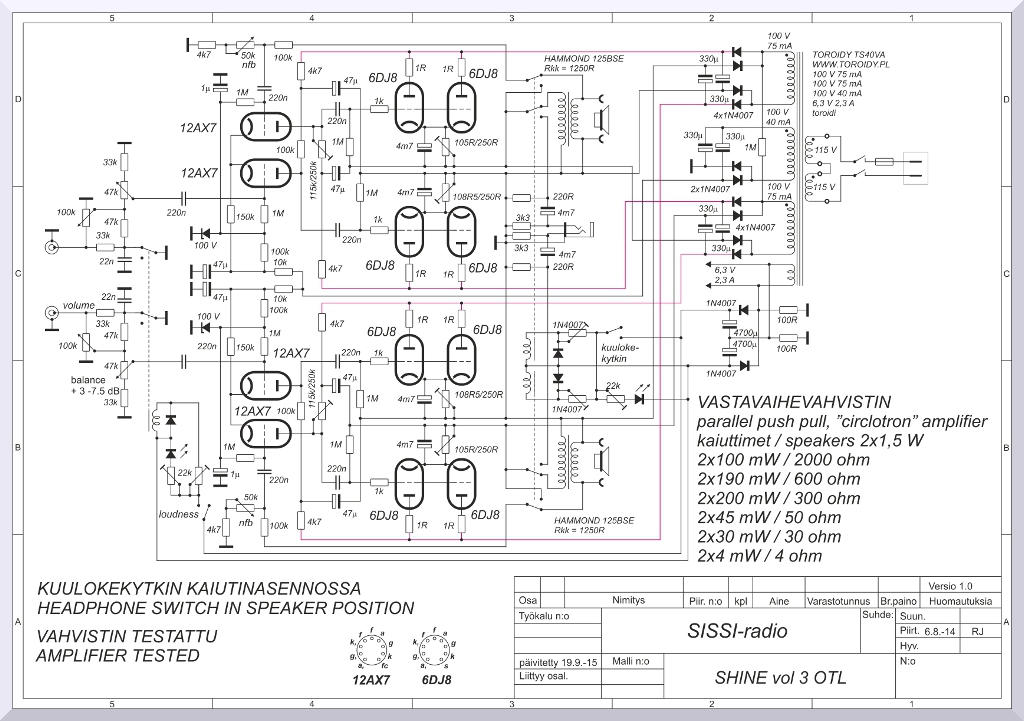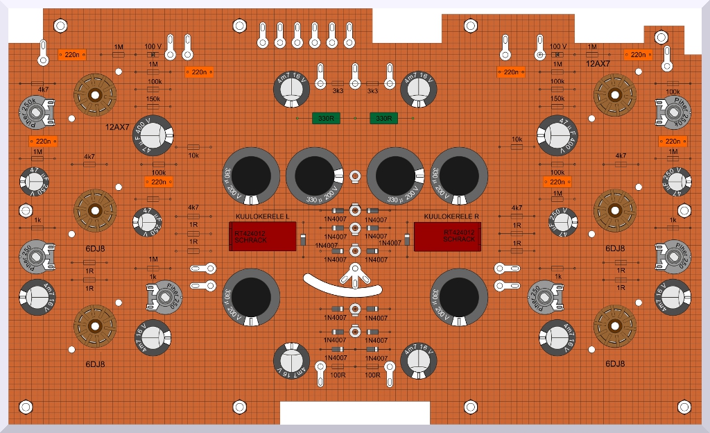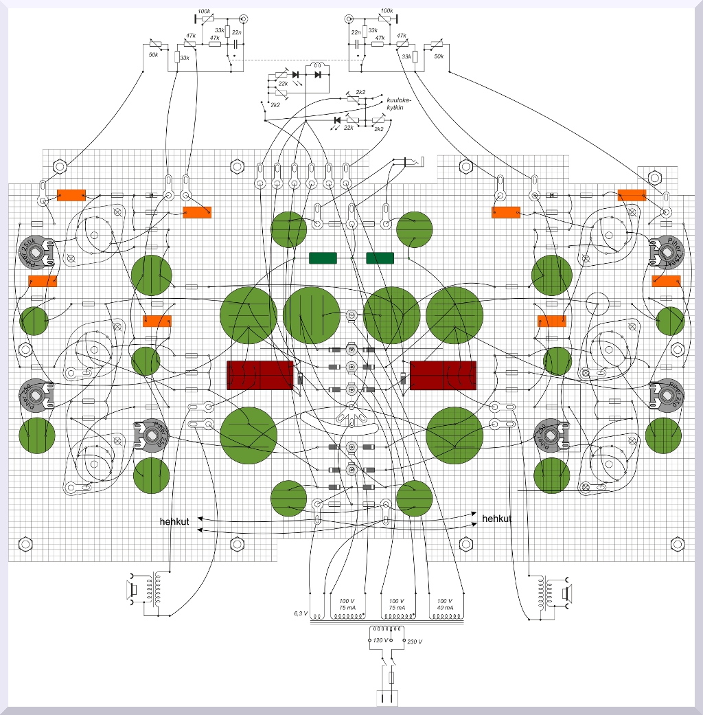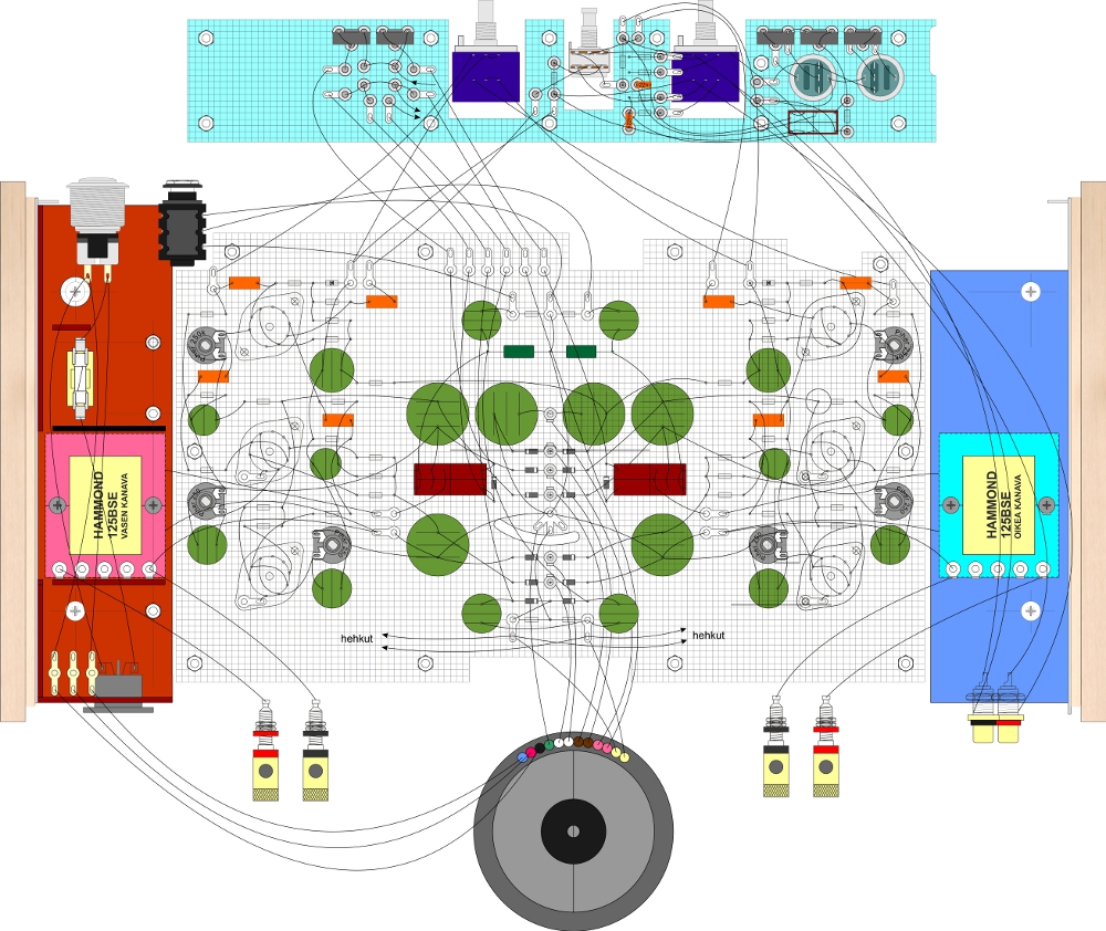 komponentit on sijoitettu vahvistimen etuosassa olevalle
