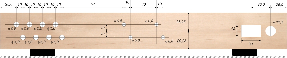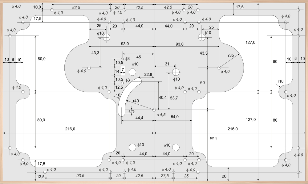 tukilevy, alempi kuva. Kuva on alapuolelta nähtynä. Tukilevy on 1,2 mm:n duralia (alumiinia).