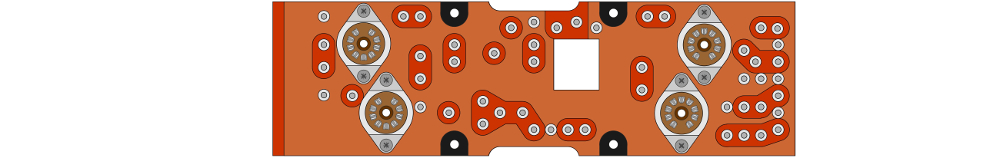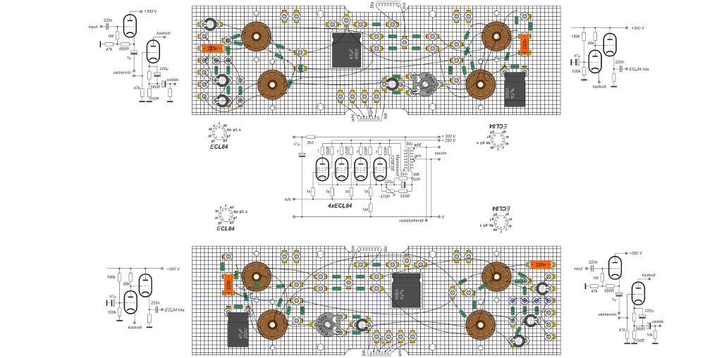 vahvistimen kytkentälevyt. Ylinnä on vasemman kanavan
